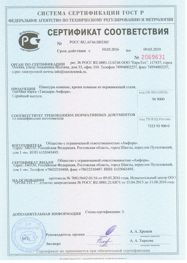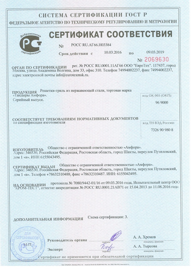 Сертификаты на тандыры и аксессуары