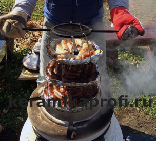 На этом приспособлении Вы сможете готовить не только курицу, цыпленка, утку, перепела и любую другую птицу в тандыре, но и одновременно картошку и овощи. С помощью стрелочек на картинке Вы можете увидеть наглядно фотографии, каким образом это происходит.